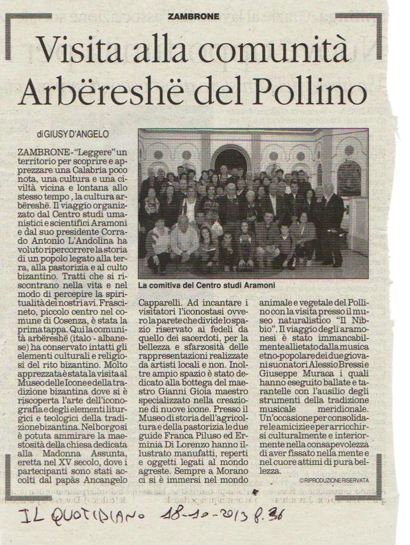ZAMBRONE - “Leggere” un territorio per scoprire e apprezzare una Calabria poco nota, una cultura e una civiltà vicina e lontana allo stesso tempo , la cultura arbëreshë. Il viaggio organizzato dal Centro studi umanistici e scientifici Aramoni e dal suo presidente Corrado Antonio L’Andolina ha voluto ripercorrere la storia di un popolo legato alla terra, alla pastorizia e al culto bizantino. Tratti che si riscontrano nella vita e nel modo di percepire la spiritualità dei nostri avi. Frascineto, piccolo centro nel comune di Cosenza, è stata la prima tappa. Qui la comunità arbëreshë (italo- albanese) ha conservato intatti gli elementi culturali e religiosi del rito bizantino. Molto apprezzata è stata la visita al Museo delle Icone e della tradizione bizantina dove, attraverso un percorso propedeutico, si è riscoperta l’arte dell’iconografia e degli elementi liturgici e teologici della tradizione bizantina. Nel borgo si è potuta ammirare la maestosità della chiesa dedicata alla Madonna Assunta, eretta nel XV secolo, dove i partecipanti sono stati accolti dal papàs Ancangelo Capparelli. Ad incantare i visitatori l’iconostasi ovvero la parete che divide lo spazio riservato ai fedeli da quello dei sacerdoti, per la bellezza e sfarzosità delle rappresentazioni realizzate da artisti locali e non. Inoltre ampio spazio è stato dedicato alla bottega del maestro Gianni Gioia maestro specializzato nella creazione di nuove icone. Paesaggi da togliere il respiro si sono potuti ammirare a Civita, il borgo fondato nel 1400 da famiglie Albanesi su un altopiano a strapiombo alle porte del Pollino. Il Museo Etnico Arbëreshë con le sue quattro sale ha disegnato perfettamente lo stile di vita di una civiltà integra e fortemente attaccata ai valori della tradizione albanese. Uno dei maggiori e migliori esempi di architettura conventuale in Calabria è rappresentato dalla Chiesa di San Bernardino di Morano Calabro. Presso il Museo di storia dell’agricoltura e della pastorizia le due guide Franca Piluso ed Erminia Di Lorenzo hanno illustrato manufatti, reperti e oggetti legati al mondo agreste. Sempre a Morano ci si è immersi nel mondo animale e vegetale del Pollino con la visita presso il museo naturalistico ‘Il Nibbio’. Il viaggio degli aramonesi è stato immancabilmente allietato dalla musica etno-popolare dei due giovani suonatori Alessio Bressi e Giuseppe Muraca i quali hanno eseguito ballate e tarantelle con l’ausilio degli strumenti della tradizione musicale meridionale. Un’occasione per consolidare le amicizie e per arricchirsi culturalmente e interiormente nella consapevolezza di aver fissato nella mente e nel cuore attimi di pura bellezza.